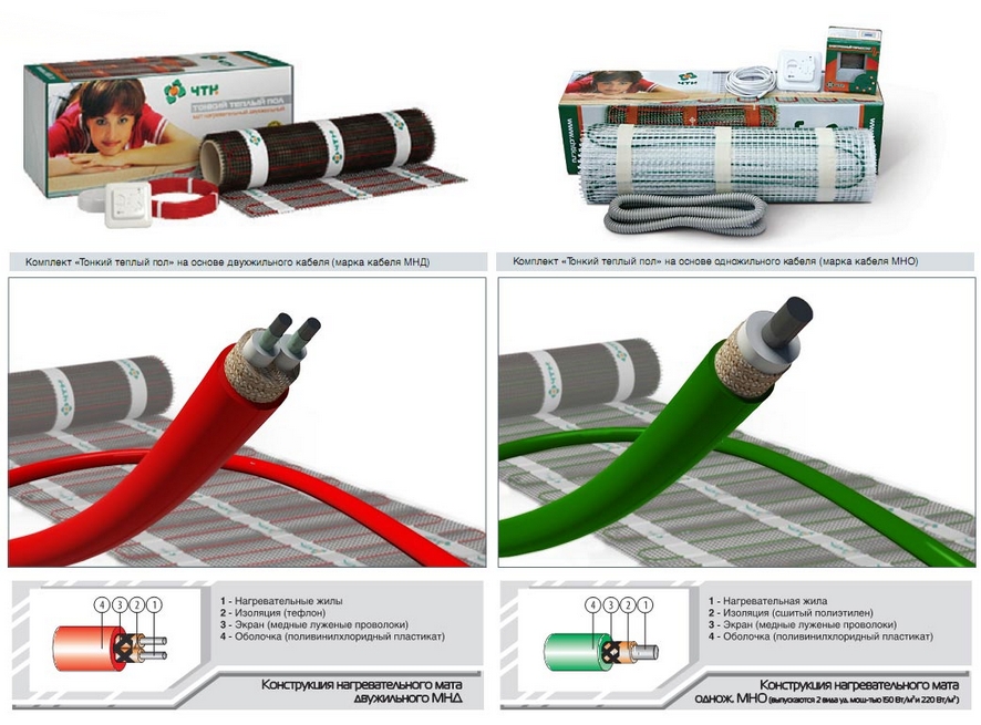 Selon la capacité, les lignes de câbles ont une épaisseur de 4 à 10 mm. Des fils plus fins sont utilisés dans les tapis. Leur section varie entre 2 et 5 mm, mais il n'y a aucun risque de dommages lors de l'installation, puisque les tapis sont déjà vendus avec des âmes fixées rigidement sur la base.