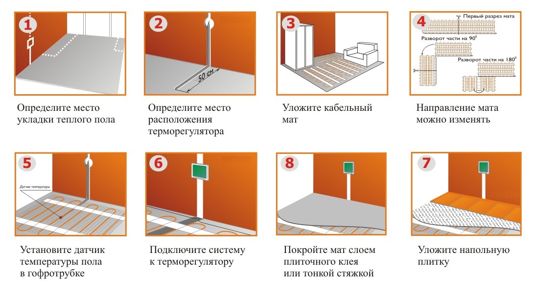 Les tapis de convection sont fixés à la base avec des agrafes, de la colle ou des vis autotaraudeuses. Les bords sont coupés de manière à ce que la distance au mur soit de 5 à 10 cm et qu'il n'y ait pas de meubles sur les éléments. La chape est facultative. Immédiatement après la fixation des éléments, des carreaux de céramique ou de pierre peuvent être posés dessus. L'avantage de cette solution est que la pièce peut être utilisée plusieurs heures après le jointoiement.