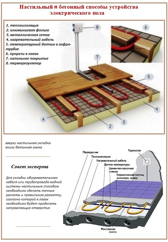 Le moyen le plus simple est d'installer un film infrarouge. Il doit être posé sur la base et collé dessus avec du ruban adhésif simple ou double face. Ensuite, au-dessus des éléments fixes, peut être posé n'importe quel type de revêtement existant, avec ou sans colle.