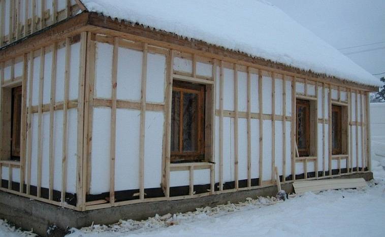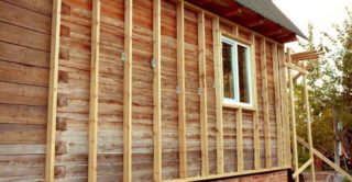 - À une distance de 80 à 100 cm, des planches traitées avec un antiseptique sont fixées au mur dans le sens vertical. Leur largeur est choisie en fonction de 2 cm de plus que la couche de mousse prévue. Compte tenu de la faible conductivité thermique de la mousse de polyuréthane, 5 à 8 cm d'isolant suffisent.