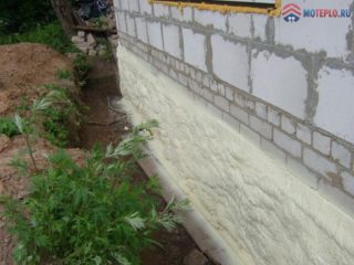 La base du ruban est isolée simultanément avec la partie souterraine. Si cela n'est pas fait lors de la construction de la structure, vous devrez mettre à nu la fondation en creusant une tranchée jusqu'au fond. Après cela, vous devrez poser les couches d'imperméabilisation et d'isolation afin qu'elles capturent la surface de la base et de la base.