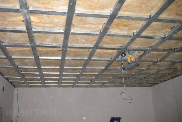 Selon la réglementation, le plafond doit être isolé avant même la pose de la toiture ; à cet effet, un bardage de surface de finition est réalisé à partir de la face inférieure des barreaux, après avoir installé un pare-vapeur.
