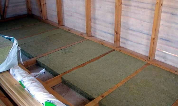 Vous devez traiter le sol après la construction des fondations. Un cerclage constitué d'une barre est installé sur les supports de sol, il est souhaitable que sa section soit de 150x150 mm et que l'installation du lattage soit commencée. Avant l'isolation du sol, les éléments en bois sont traités avec un composé protecteur. Après cela, un sol rugueux est fixé sur les poutres à partir de planches bordées ou non d'une épaisseur d'au moins 25 mm. Au-dessus, il est nécessaire d'installer le matériau d'isolation sélectionné et une couche supplémentaire d'isolation à la vapeur. Étant donné que la principale perte de chaleur se produit à travers le sol, plusieurs couches d'isolation sont placées sur les étages inférieurs et alternent leurs directions à des angles de 90 degrés.