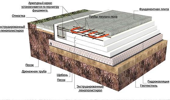 Dalle isolée - base de dalle équipée de matériaux isolants résistants à l'humidité et de réseaux d'ingénierie. Une caractéristique distinctive de l'USHP (plaque suédoise isolée) est la faible profondeur.