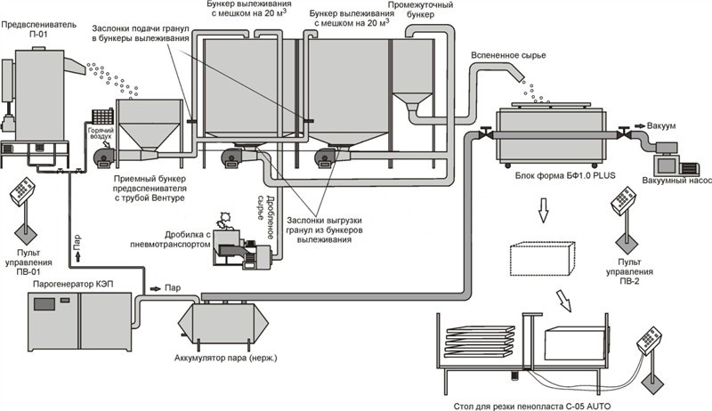 Dans les lignes industrielles, le polystyrène est chauffé à la température de fusion et amené à la tête d'extrusion par des dispositifs à vis. Sous l'influence de la vapeur chaude et de la haute pression, le polystyrène est moussé, après quoi il est acheminé vers la ligne de formage, où il est aplati.