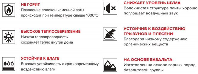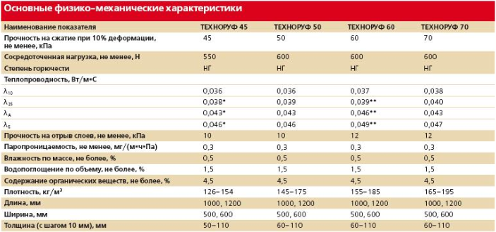 Technoruf N Extra a une densité de 100 kg/m3, est utilisé pour le dispositif de la couche isolante inférieure dans une structure multicouche lors de l'isolation d'un toit plat. Le matériau incombustible a une résistance à la compression de 30 kPa, une conductivité thermique de 0,039 W/m·s.