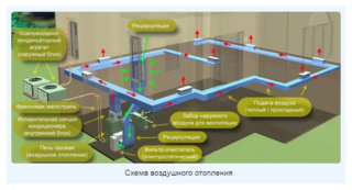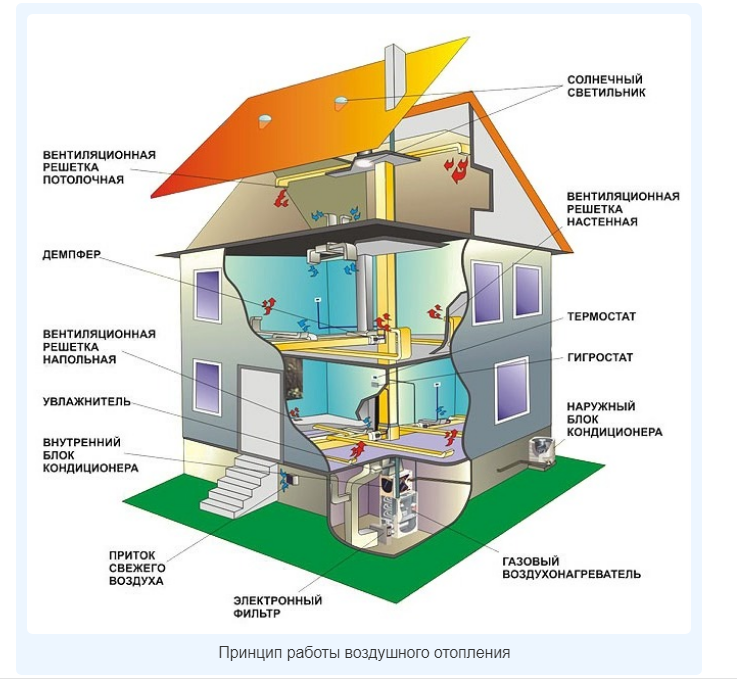 Les caractéristiques du fonctionnement du chauffage utilisant un système à air résident dans le transfert d'un flux d'air chaud vers une chaudière ou un échangeur de chaleur. L'air chaud pénètre dans la pièce par des conduits d'air ou directement. En raison du "chemin" court, il n'a pas le temps de se refroidir, ce qui permet d'obtenir une température uniforme et optimale dans la maison.