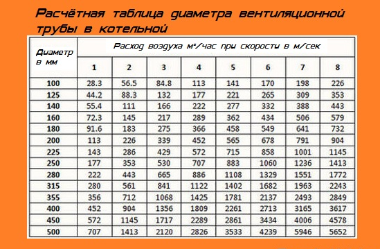 Dans les systèmes de chauffage fonctionnant entièrement au gaz, un schéma ou un rapport est utilisé dans lequel pour chaque 10 kW de puissance, il y a 0,01 m3 d'air soufflé par seconde. Avec un indicateur déclaré de 30 kW, la ventilation nécessitera une capacité d'environ 0,03 m3/s avec une petite marge. Après cela, à partir du tableau donné dans SNiP, le diamètre de la hotte est trouvé - au moins 130 mm. Si cet indicateur ne permet pas un échange d'air normal, un système d'alimentation forcée est installé dans la pièce.