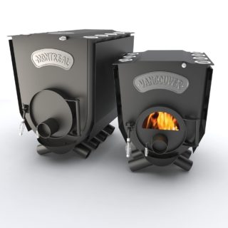 Appareil canadien avec système de chauffage par conduit d'air. Le poêle puissant convient à une installation dans une maison, une buanderie, un atelier, un garage. Fonctionne sur tous les types de combustibles solides, à l'exception du charbon. Il chauffe en 10-15 minutes, la deuxième pose de bois de chauffage peut être effectuée en 8-10 heures.