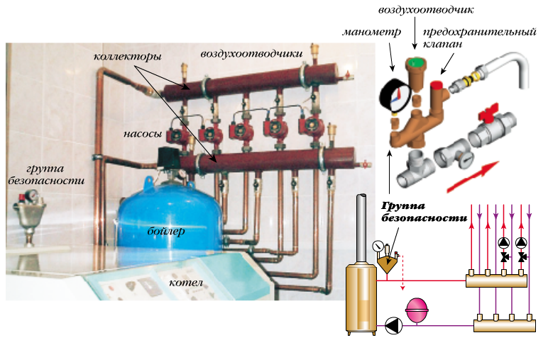 Tout d'abord, la vanne d'air pour l'alimentation en chaleur est montée dans le groupe de sécurité avec un drain et un manomètre. Dans le circuit de chauffage, ils sont situés sur une ligne droite partant de la chaudière. À cet endroit, la température la plus élevée du liquide de refroidissement, ainsi que les indicateurs de pression maximale. Dans le circuit collecteur, il est obligatoire d'installer des vannes de vidange d'alimentation en chaleur sur chaque collecteur.