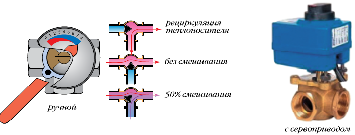 Pour réguler la température de l'eau dans les systèmes à deux tuyaux et collecteurs, une vanne mélangeuse à trois voies est installée dans le système de chauffage. Il se raccorde aux tuyaux d'alimentation et de retour.