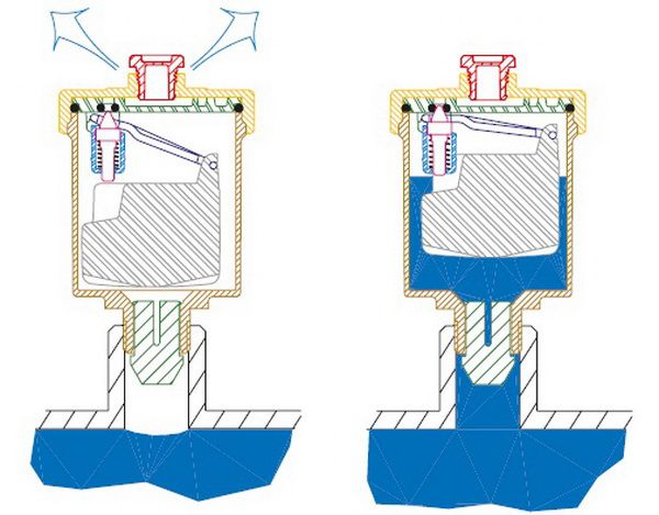Pendant le fonctionnement de l'alimentation en chauffage, des poches d'air peuvent se former dans les tuyaux et les radiateurs. La raison en est la teneur élevée en oxygène dans l'eau, la température du liquide de refroidissement est supérieure à + 100 ° C. En conséquence, l'oxydation des composants métalliques se produit et la distribution de la température change. Pour éviter ces situations, il est nécessaire d'installer des vannes pour purger l'air du système de chauffage.