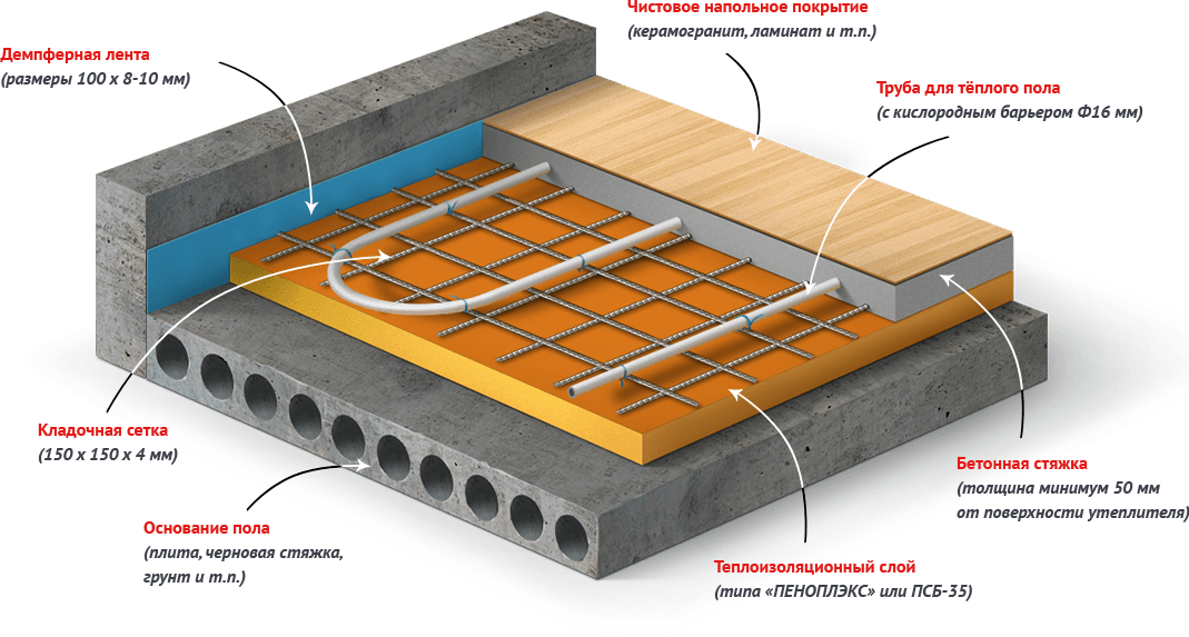 Lors de l'aménagement d'un plancher d'eau, les tuyaux peuvent être coulés dans une chape, installés dans des moules ou recouverts d'un matériau en vrac thermoconducteur, puis recouverts de dalles. Dans tous les cas, avant la fermeture, le circuit doit être vérifié pour les fuites sous pression pendant 1,5 à 2 heures.
