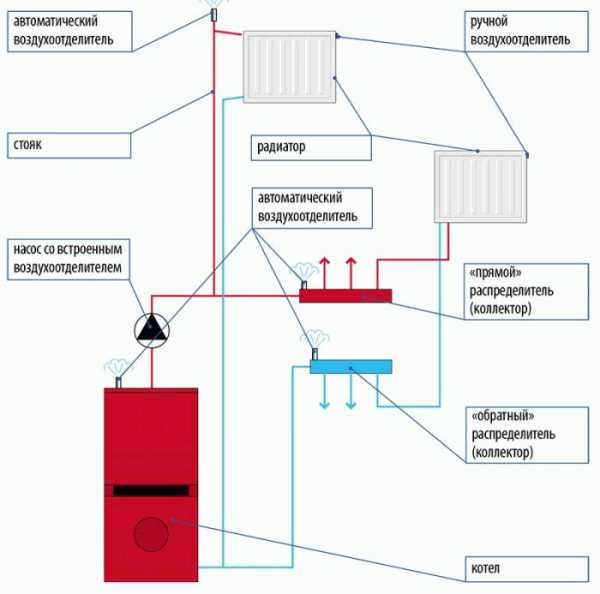 Le schéma de désaération à plusieurs étages prévoit l'installation de dispositifs automatiques sur toute la ligne. Une telle connexion des dumpers permet une suppression locale et simultanée des sas. Le dispositif automatique est placé dans la zone de retournement, la formation d'une boucle. Pour prolonger la durée de vie de la vanne, un filtre est en plus monté. Une fois assemblé, le système fonctionne lorsque le radiateur est chaud en bas mais froid en haut.