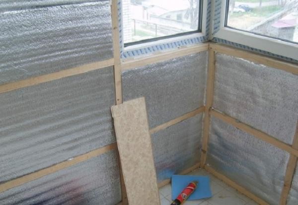 - Les plaques sont installées avec une couche de papier d'aluminium entre les supports de cadre à l'intérieur de la pièce. Ceci est fait pour que la feuille reflète le flux de chaleur dans la pièce, et non dans la direction opposée.