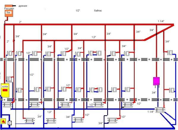 Cependant, vous devez connaître les inconvénients d'un tel régime. La tuyauterie nécessitera plus de matériel qu'un système de tuyauterie inférieur. En conséquence, le volume total du liquide de refroidissement augmente, il sera nécessaire d'installer une chaudière avec des caractéristiques de puissance accrues.