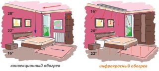 Un radiateur infrarouge transmet un rayonnement électromagnétique aux objets proches. Lorsqu'un objet se réchauffe, l'air chaud qu'il contient est redirigé vers la pièce. Tout d'abord, la technique "prend" les murs, le plafond et le sol, puis l'air.