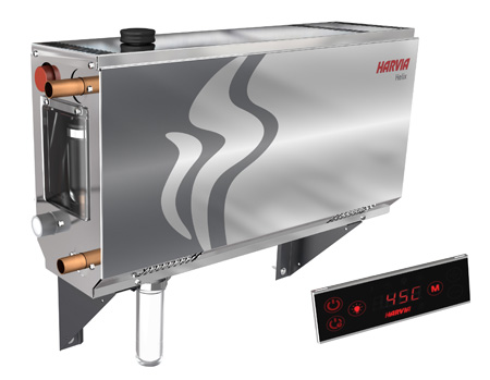 La conception contient un corps, une couche de matériau d'isolation thermique, une unité de commande et un élément chauffant. Le principe de génération électrique du poêle de sauna Harvia permet de chauffer des pierres sans combustible solide ou liquide. La température dans le bain augmente après avoir appuyé sur le bouton de la télécommande. L'unité chauffe l'air et le réservoir d'eau intégré.