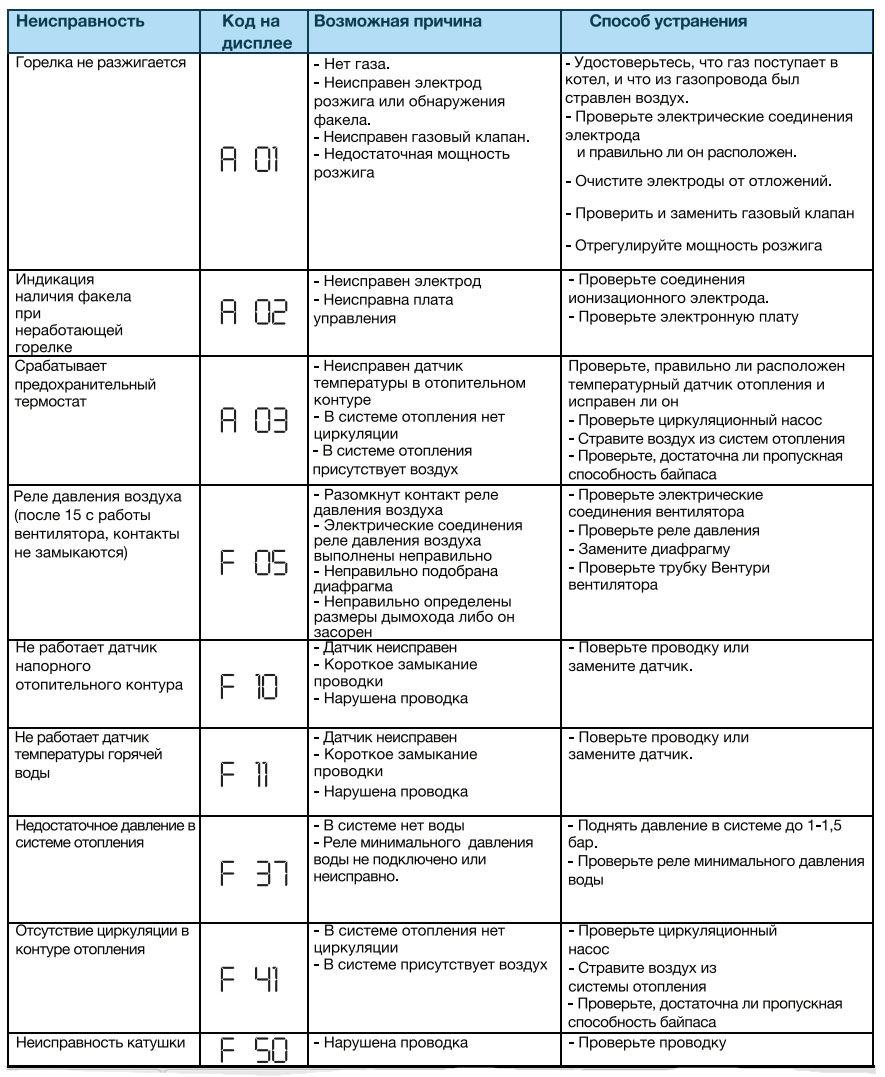 - A 01 - pas de flamme de brûleur et pas d'allumage. Vous devrez vérifier le débit de gaz, la puissance installée, la pression dans la buse. Lorsque l'air s'accumule dans le système, il est libéré par les robinets.