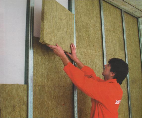 - L'installation de laine minérale se poursuit jusqu'à ce que le mur soit complètement caché en dessous.