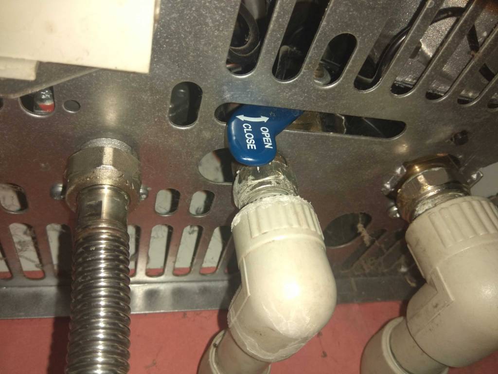 - Le tuyau a une légère pente vers le bas. À cet endroit, un robinet est installé, grâce auquel l'excès d'eau est éliminé. Il y a aussi un tuyau de dérivation avec un clapet anti-retour pour le remplissage du liquide de refroidissement. Si un tuyau de l'alimentation en eau y est connecté, ouvrez le robinet. Sinon, le liquide est rempli avec un tuyau. La pression doit être légèrement plus élevée que dans le système de chauffage.