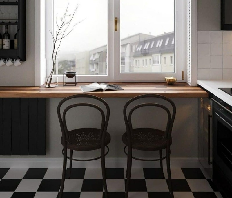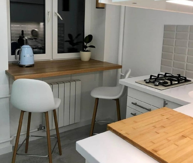 Si la cuisine est trop petite ou trop étroite et allongée et que la table ne rentre pas du tout, utilisez plutôt un rebord de fenêtre. Il faut d'abord l'agrandir en le transformant en plan de travail.