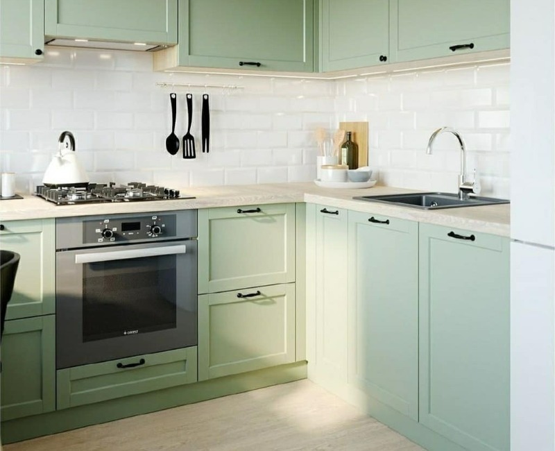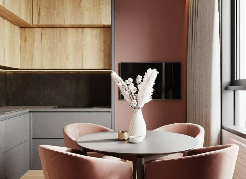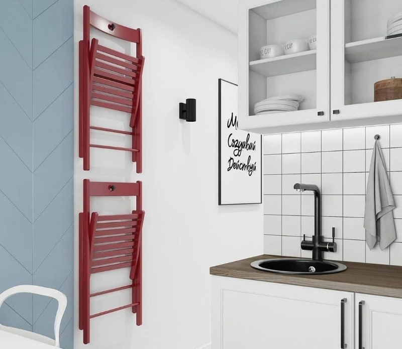 Faites attention aux chaises pliantes qui s'accrochent au mur et ressemblent à une décoration d'intérieur. Mais c'est vrai, il n'y a nulle part où les mettre dans un si petit espace avec une superficie de seulement 5,1 m2. Je tiens à souligner que cette cuisine utilise également un système de rangement à deux niveaux pour les ustensiles de cuisine.