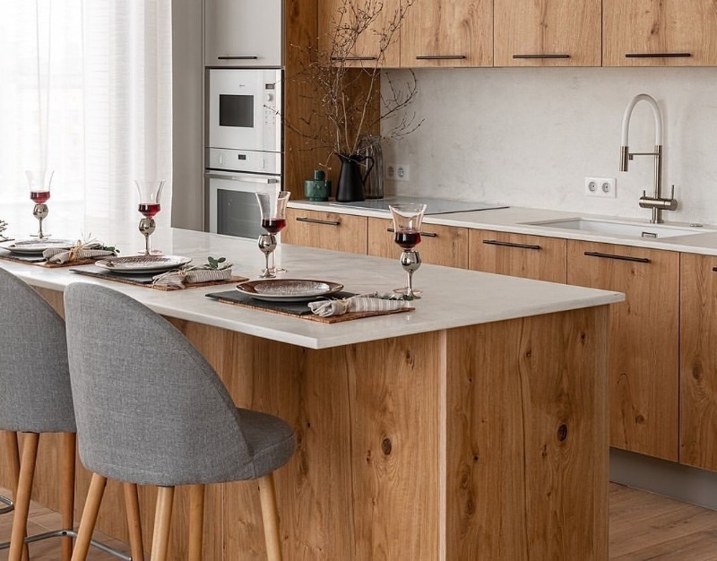 Initialement, l'hôtesse voulait faire la cuisine en une seule ligne, mais une cuisinière à gaz avec des tuyaux et une vanne qui ne peut pas être recouverte de meubles a influencé sa décision.