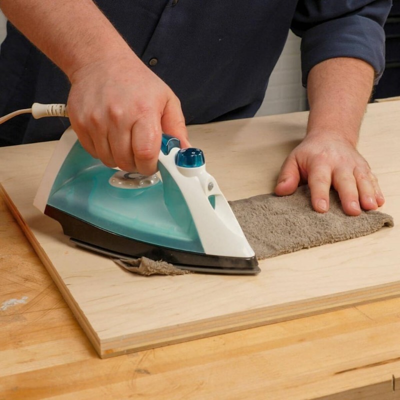 L'étape suivante consiste à repasser le bois à travers un chiffon doux. Vous aurez besoin d'un fer à repasser avec option vapeur et d'un morceau de coton ou de lin plié en plusieurs couches.