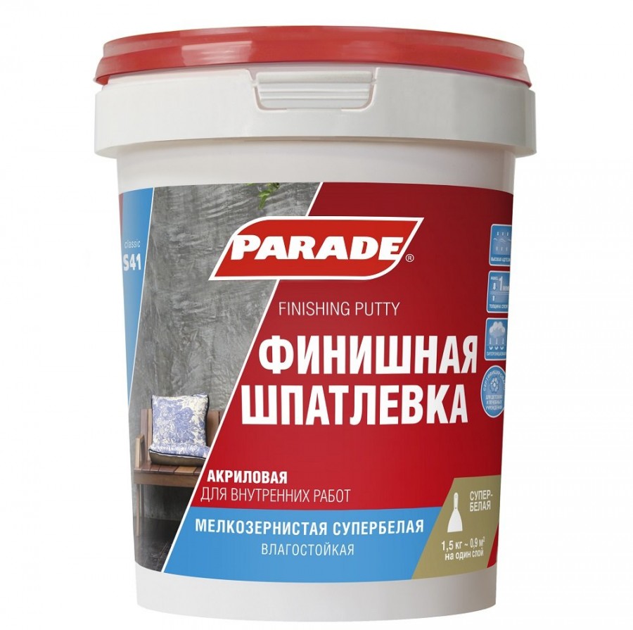 Pour niveler les murs dans les pièces sèches, la composition convient Défilé S40. Il est flexible, remplit bien les fissures et est facile à meuler. Il peut être appliqué à la spatule en plusieurs couches de 0,1-0,2 cm, tandis que l'épaisseur totale peut atteindre 0,5 cm.Le travail doit être effectué à des températures supérieures à +12 degrés et une humidité ne dépassant pas 80%.