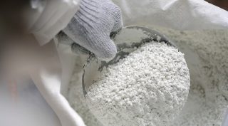 - poudre sèche blanche, jaunâtre, rosâtre ou grise, opaque et microporeuse ;