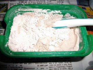 - en mélangeant, la poudre est introduite petit à petit, en malaxant constamment jusqu'à consistance lisse ;