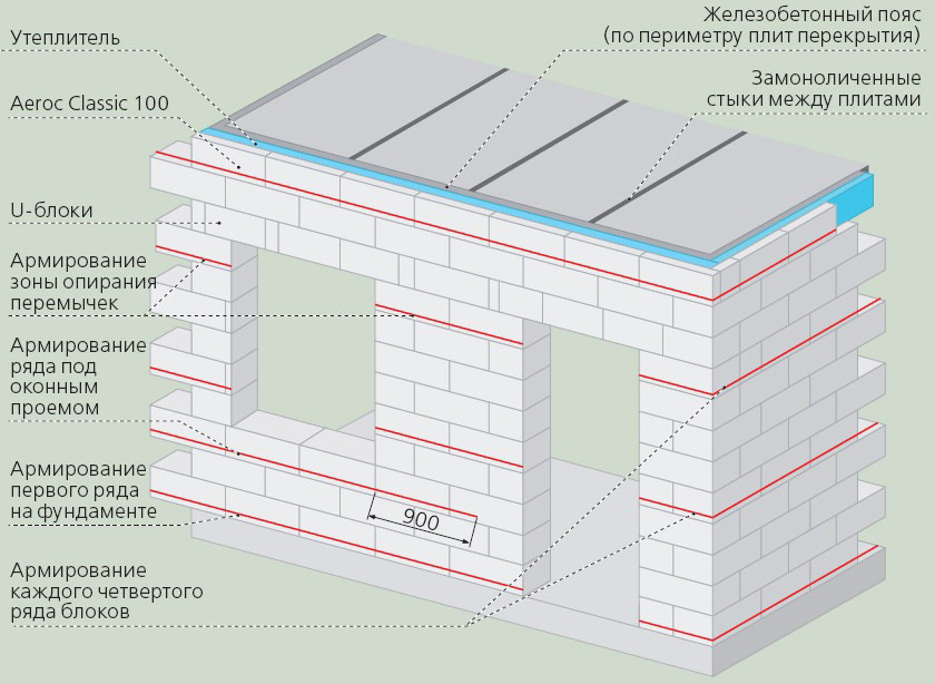 On pense souvent que la charpente en béton armé d'un bâtiment, dont les murs sont remplis de blocs aérés, joue le rôle de renfort. Ce n'est pas le cas : la charpente supporte des charges supplémentaires, et les murs restent autoportants.