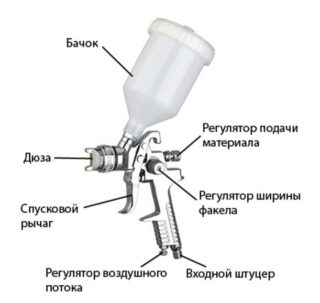 Peignez avec un pistolet à une distance de 30 à 50 cm pour obtenir une couche uniforme sans gouttes. Les inconvénients incluent l'inefficacité de la pulvérisation, la toxicité d'un nuage brumeux autour du lieu de travail.