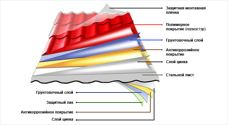 Le revêtement polymère sur le carton ondulé le protège de la corrosion. La peinture de la feuille profilée a une texture, une couleur différente, imite les matériaux naturels. La surface de la façade ou du toit en métal professionnel coloré est esthétique et belle. Auparavant, ils utilisaient la galvanisation sans peinture polymère, les surfaces servaient pendant 20 à 25 ans. Les polymères modernes fonctionnent sans dégradation pendant environ 45 à 50 ans.