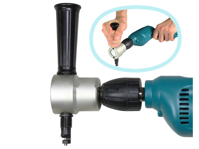 Le foret pour couper le métal ou la tôle profilée est fixé sur le mandrin. Le principe est similaire à l'installation de cisailles à poinçonner électromécaniques.