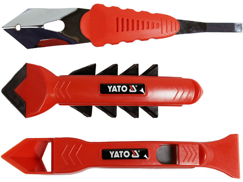 - Grattoir en plastique - option pour surfaces molles. Il n'endommage pas le plastique et le bois, mais il élimine assez efficacement le mastic séché.