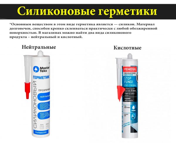 - Acide - comprend l'acide acétique, utilisé pour sceller les joints dans les structures en bois, en céramique et en plastique. Ne convient pas aux matériaux contenant du ciment, ainsi qu'au métal, au verre et à la pierre naturelle, car il les corrode.