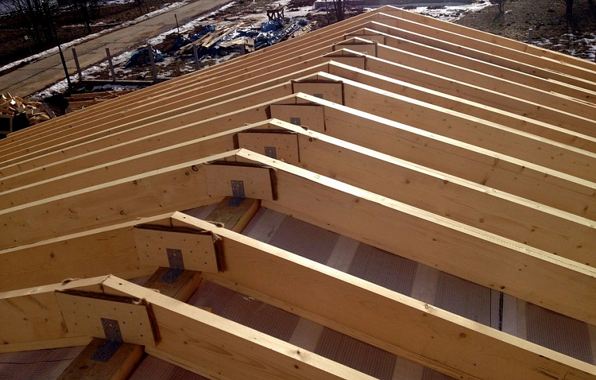 - Sont en train d'être érigés système de chevrons... Avec une petite surface de la maison, il est ramassé au sol, puis surélevé. Si le toit est complexe et grand, le système est monté en haut.
