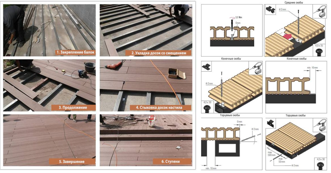 Ensemble de planches de terrasse méthode ouverte et fermée... La première méthode convient à l'installation à faire soi-même, car elle est simple, tout en économisant sur les fixations. Le prix de l'installation par méthode ouverte est 2 fois inférieur à celui d'une installation avec pinces.