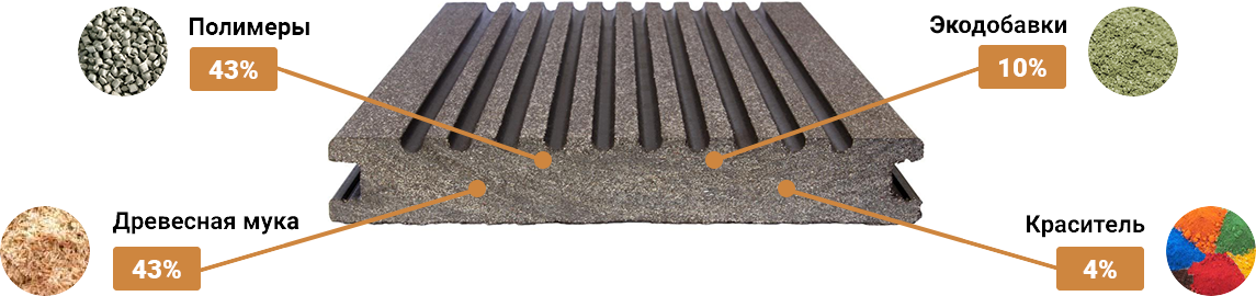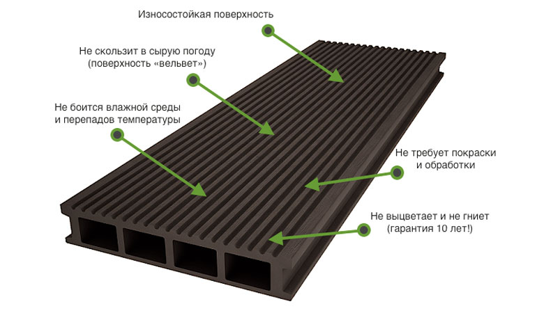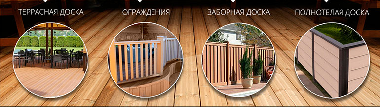 Le matériel a aspect bois, mais les caractéristiques la rapprochent de la combinaison compositions polymères. Les composés de haut poids moléculaire confèrent aux produits des qualités supplémentaires que l'on ne trouve pas dans les produits naturels. Le bois a longue durée de vie, ils ne perdent pas leurs propriétés pendant 20 à 30 ans, selon la qualité des polymères et le type de particules de bois.