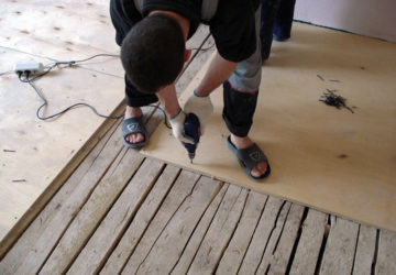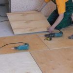 L'installation n'est pas très différente de la technologie de pose sur une chape en béton. mais il est important de s'écarter du mur d'au moins 1 cm lors de l'assemblage du revêtement de sol... Les tôles sont empilées en insérant le tenon dans la rainure. L'épine est pré-enduite de colle. Dans ce cas, les vis autotaraudeuses ne sont pas utilisées pour la fixation. L'installation commence à partir du mur du fond - il est important de suivre la direction ici.