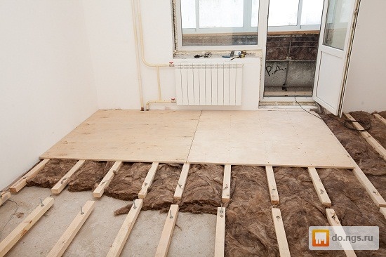 Si le sol est installé sur les décalages, la base doit être cuite plus longtemps. Vous devez calculer la quantité de bois requise pour la bûche. Traitez-les avec de l'antipyrine et des antiseptiques. Il n'est pas nécessaire de niveler le sol dans ce cas. Cependant, il faut se soucier des décalages formant un avion. Pour ce faire, utilisez le niveau pour étudier l'état du sol. Les bosses et les fissures profondes sont scellées avec du mortier de ciment ou du plâtre. Les différences de hauteur ne sont pas compensées, cependant, dans les endroits où la dépression ou l'élévation est trop grande, cela doit être pris en compte.