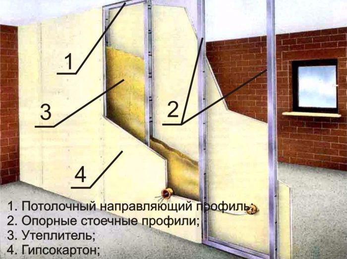 L'installation des plateaux et des pentes est effectuée après l'achèvement des murs. L'installation d'une porte coulissante est effectuée après que l'ouverture est faite de tous les côtés avec des plaques de plâtre.