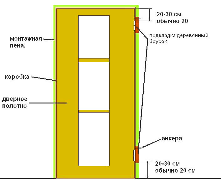 - Monter le vantail de la porte, vérifiez l'exactitude de l'installation, ajustez les jeux, moussez les vides entre le cerclage et le cadre.