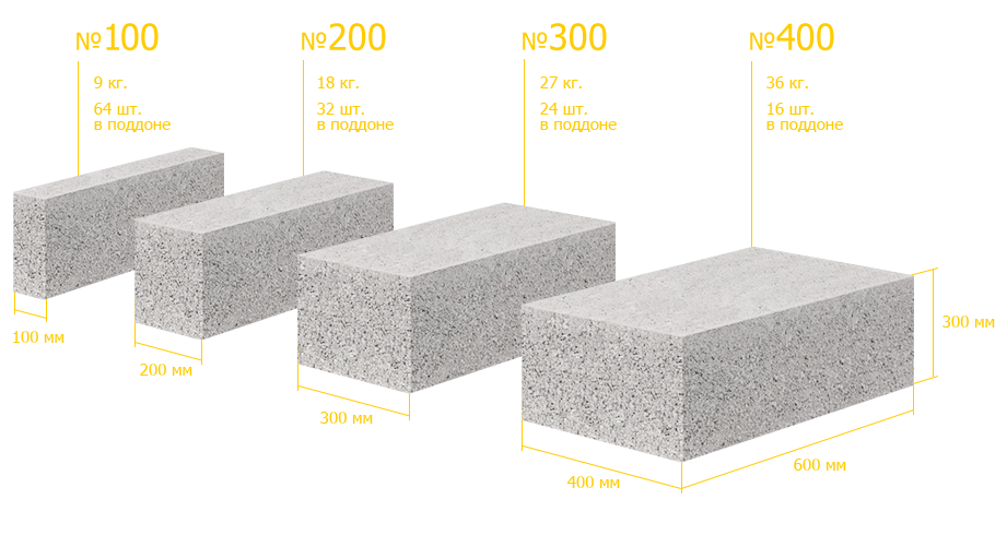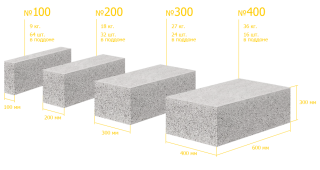 Dimensions du béton cellulaire sont produits: en longueur - 600 et 625 mm, en largeur ils font 500, 400, 350, 300, 200, 150, 100 et 75 mm, en hauteur - 250 et 200 mm.