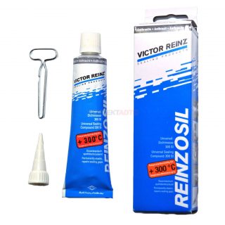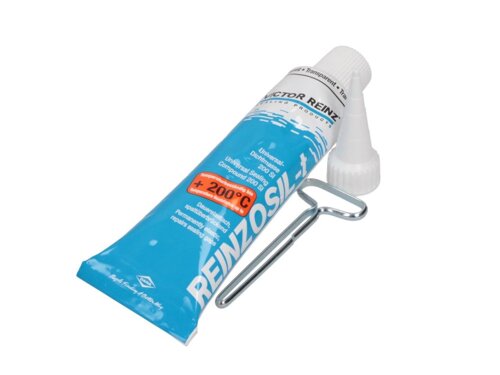 - Victor Reinz Reinzosil-t - destiné à être appliqué sur des surfaces dans lesquelles des éclats et des fissures doivent être remplis. Cela ressemble à un gel transparent. Il n'est pas si résistant à la chaleur - il peut supporter jusqu'à + 200 ° C, mais n'a pas peur des rayons ultraviolets. Le matériel est proposé en tubes de 70 ml.