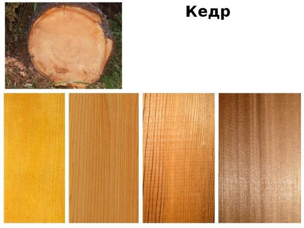 Bois cèdre appartient à la catégorie des antiseptiques naturels. Il n'y a pas de bactéries dans les maisons, l'air présente des signes de stérilité. Le bois est doux, avec une texture expressive, lisse, conduit mal la chaleur. La race convient à la fabrication de revêtements, de lames de parquet et de matériaux de finition.