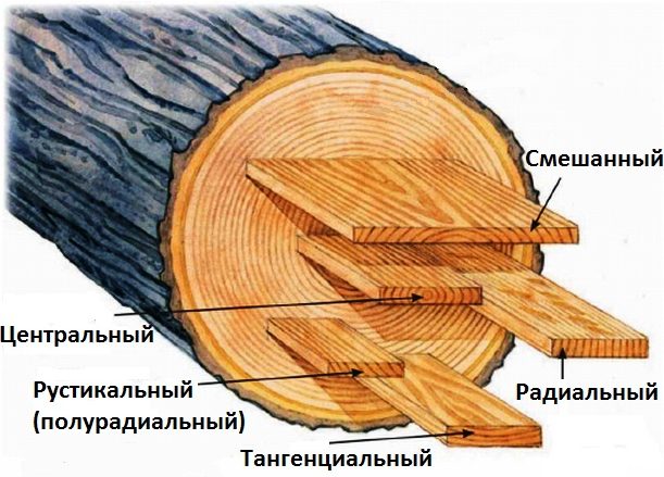 - coupe radiale - les éléments sont produits en divisant les bûches le long du rayon des cernes annuels ;