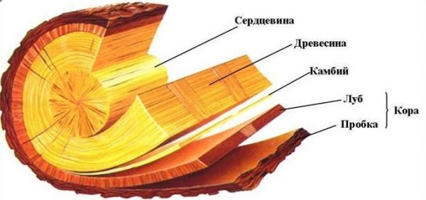 Des canaux de résine se développent dans l'épaisseur des cellules parenchymateuses. L'épicéa et le pin ont de telles formations, tandis que l'if et le sapin sont absents. La section entre l'écorce et le bois est appelée cambium.
